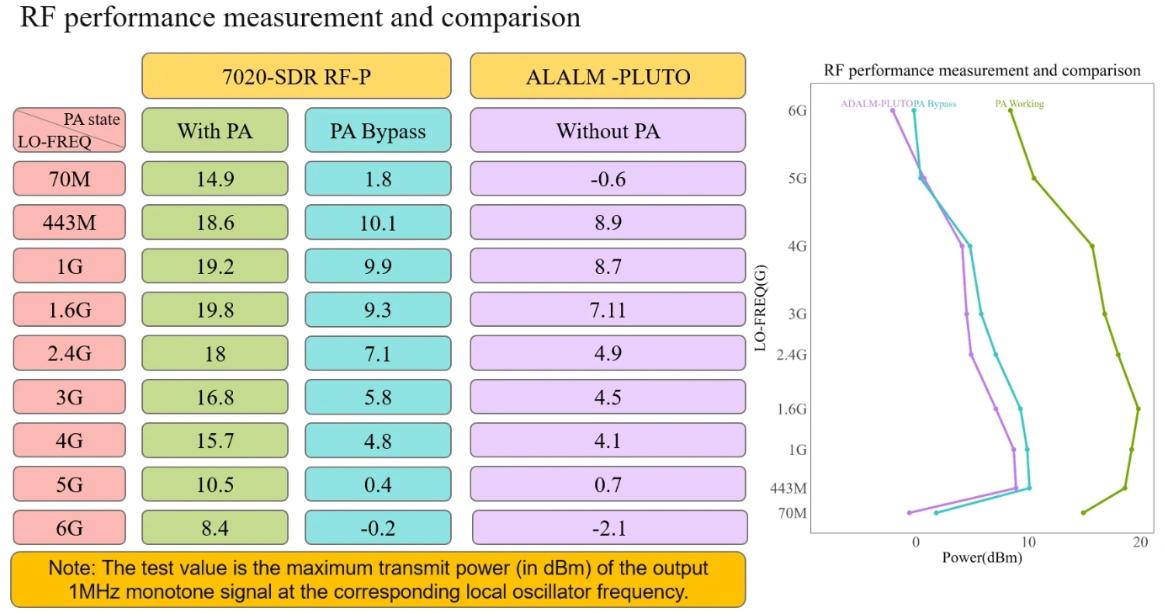 The output power varies from +14 dBm to +7 dBm, thanks to the external PA. There is still 7dB of variation across the whole range. So despite being much shorter than the LibreSDR TX path, it is still quite lossy.