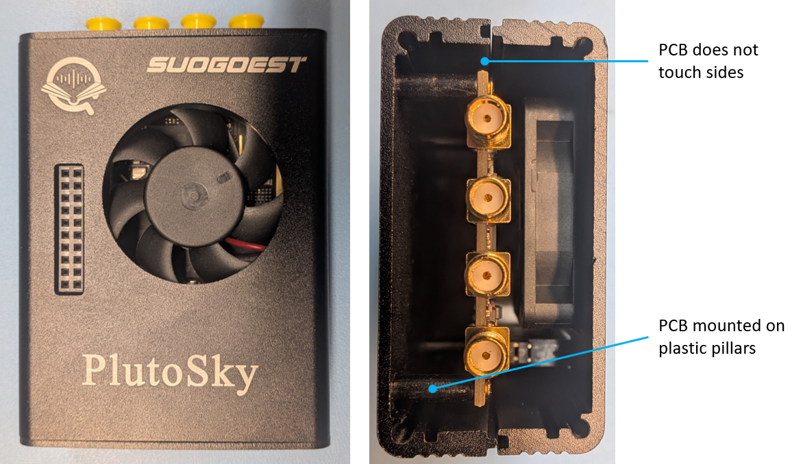 Mechanically the device comes in a metal enclosure, with a fan. The fan is loud, which is annoying compared to a fully passive (and silent) LibreSDR, but it is needed: upon opening the device it appears that the PCB is thermally isolated from the metal enclosure. It is mounted on plastic pillars and has no contact with the enclosure, hence the need for a fan.