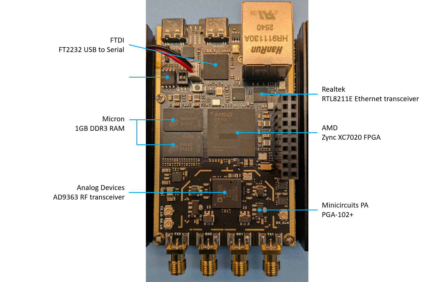 325~3800 MHz (AD9363) or 70~6000MHz (AD9361) |